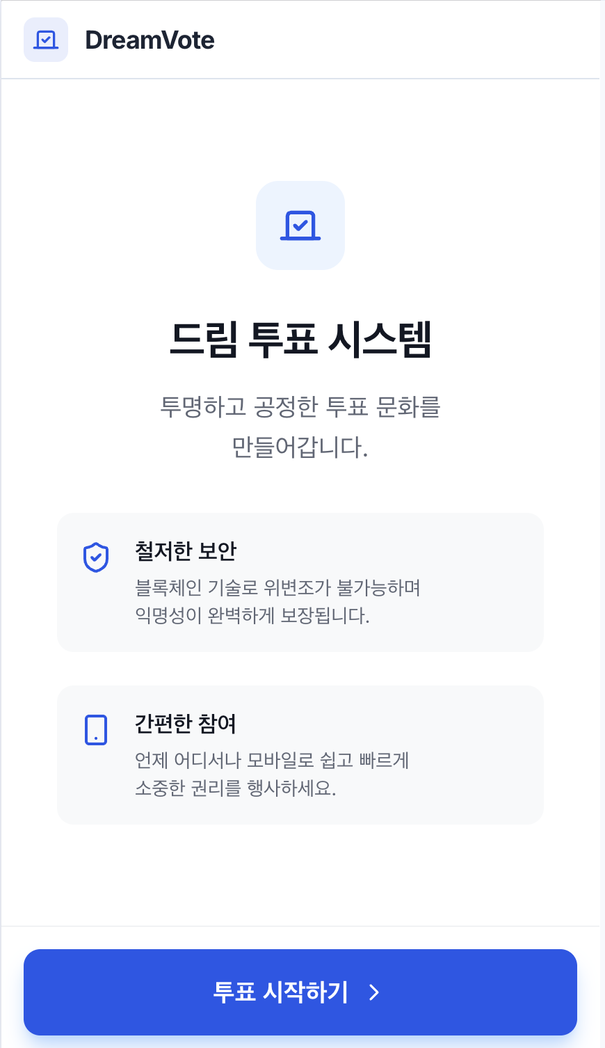 DreamVote는 전자투표와 현장투표를 함께 지원하는 하이브리드 투표 관리 플랫폼입니다.